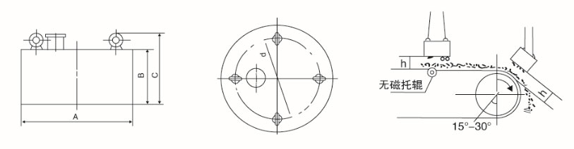 型號> 冷卻方式 適應帶寬 mm 額定高度 mm 磁場強度 mT 勵磁功率 kw 適應帶速 ≤m/s 外形尺寸mm φD×B 重量